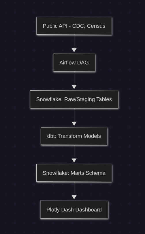 Plotly Dash sat on top and queried Snowflake directly. It gave me a fast, clean way to surface COVID-19 and census trends in real-time — with no need for Grafana or other observability or BI tools, just keeping it in python. How much I enjoyed Plotly Dash was the biggest surprise of the project.